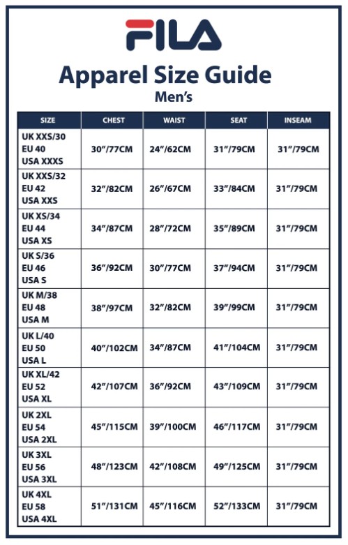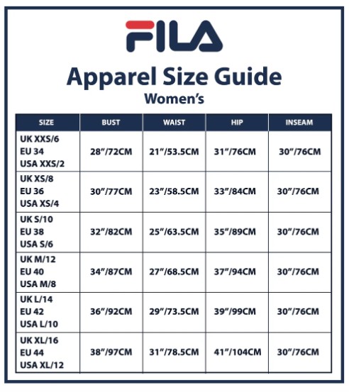 Click on the image to see the full sized image of the Fila Menswear and Womenswear size guides